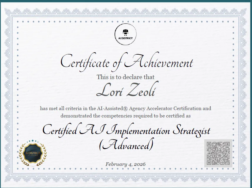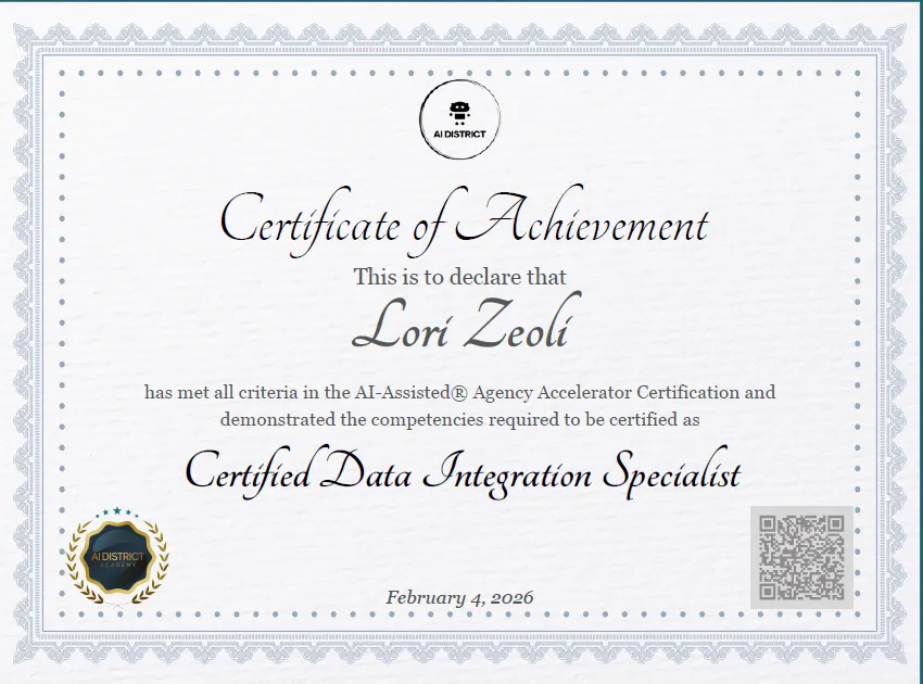 With an MBA and certifications as an AI-Assisted Consultant, Implementer, and Data Specialist, along with her credentials as a PROSCI ADKAR Change Management Practitioner, Lori brings a rare blend of technical fluency, business acumen, and human understanding to every engagement. Her spiritually grounded, people-first approach consistently yields transformative results for her clients.