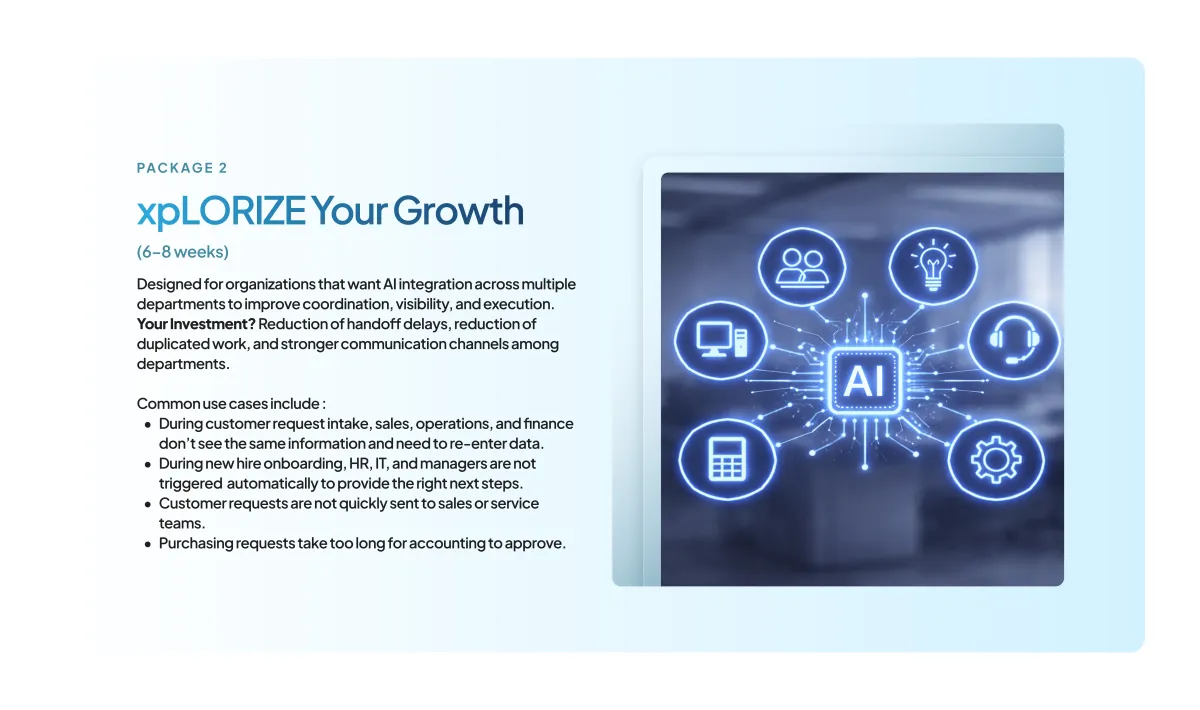 The xpLORIZE AI Advisors Response: That is why we begin with a comprehensive AI readiness assessment that evaluates workflows, systems, data, and team capabilities to ensure every solution is grounded in strategy and realistic adoption goals.