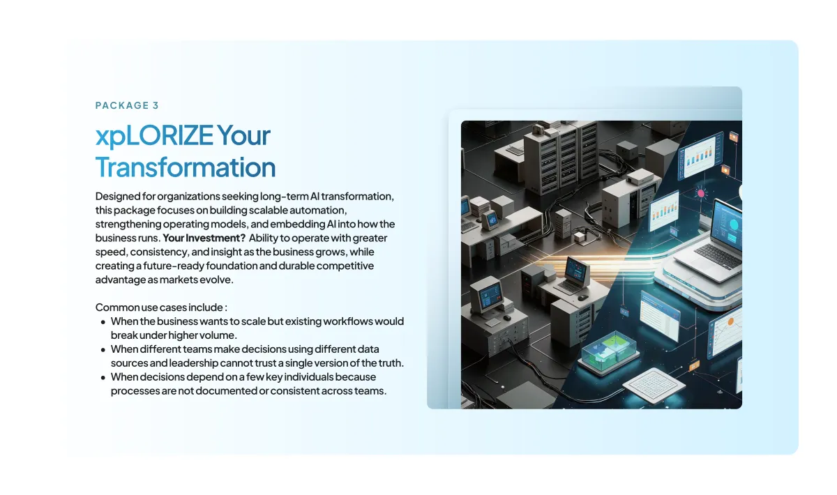 Our services are delivered through 3 distinct packages, each designed based on the findings of your AI readiness assessment and the level of operational changes involved.