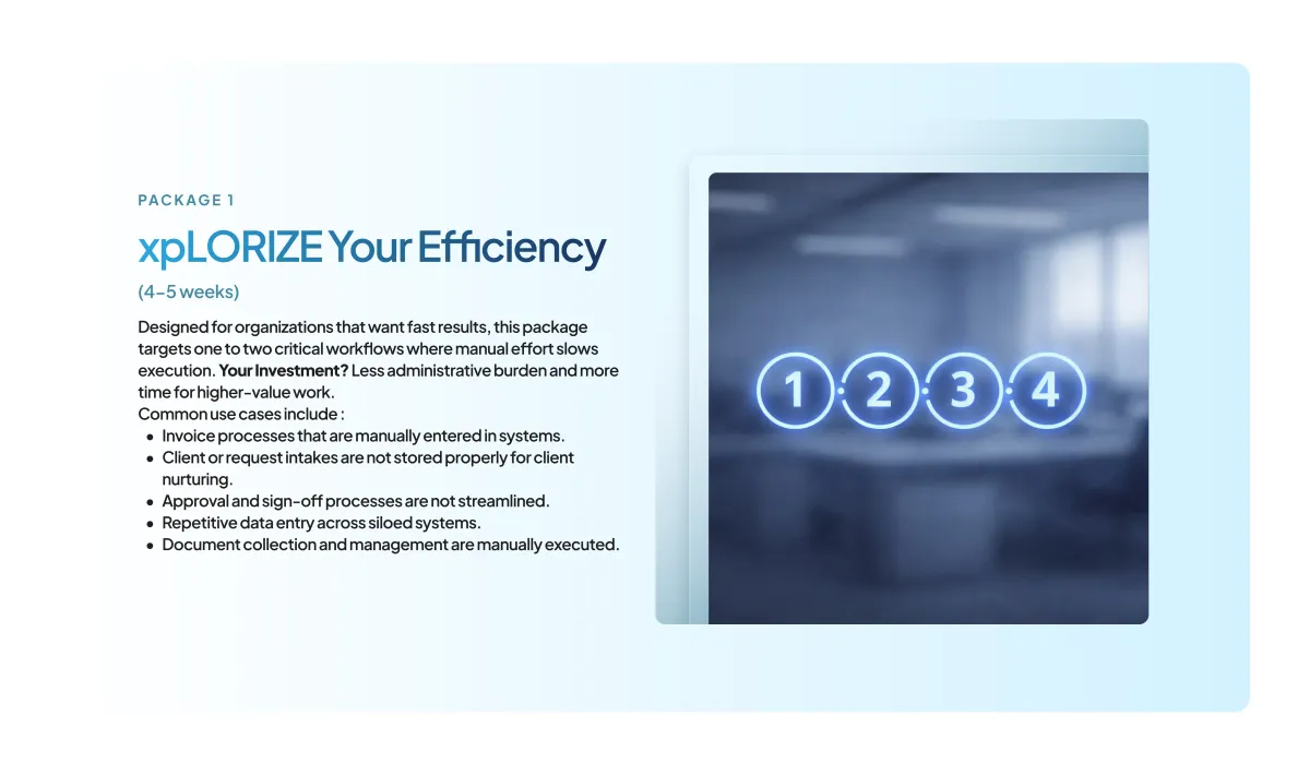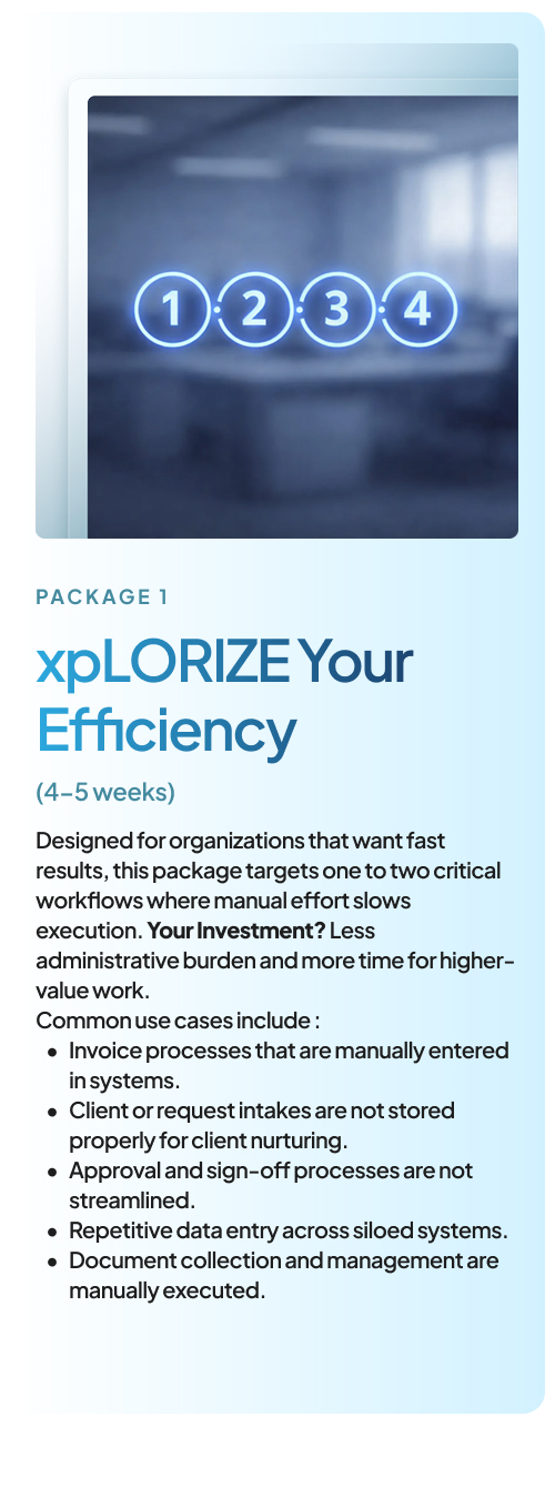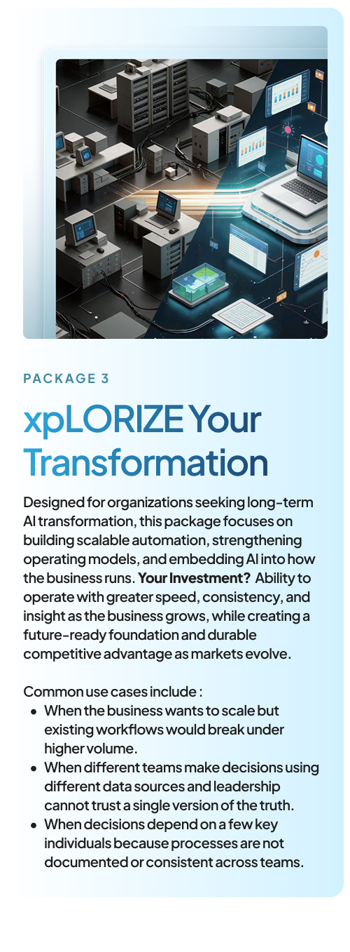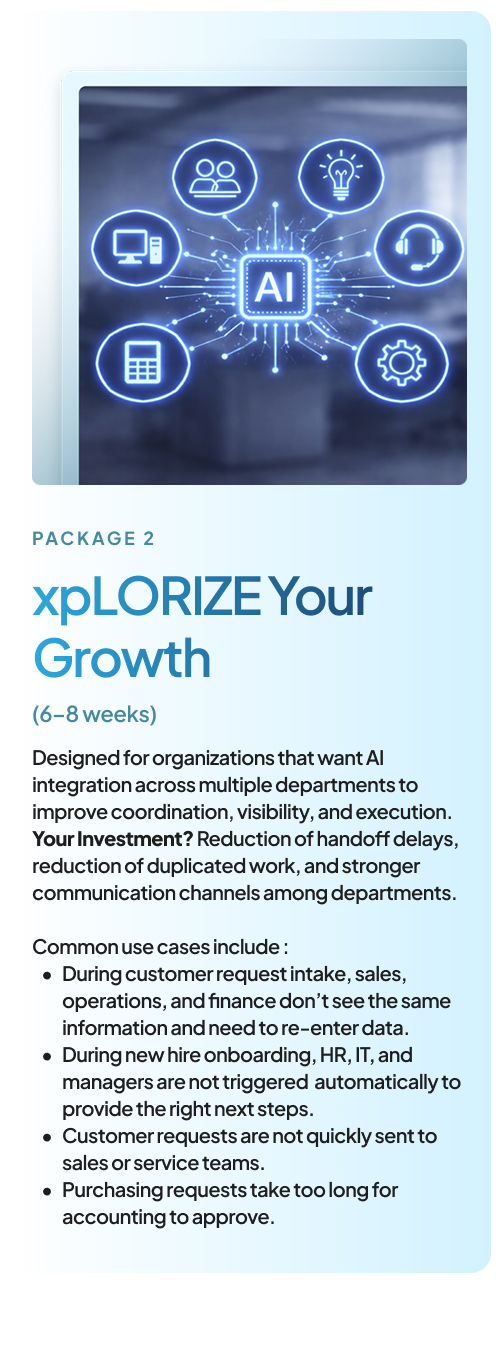 The xpLORIZE AI Advisors Response: That is why we redesign your workflows with AI enabled processes that remove manual work, increase accuracy, and create faster, more consistent execution across your organization.